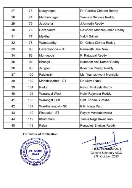 ਤੇਲੰਗਾਨਾ ਕਾਂਗਰਸ ਵੱਲੋ ਜਾਰੀ ਕੀਤੀ ਦੂਜੀ ਸੂਚੀ…