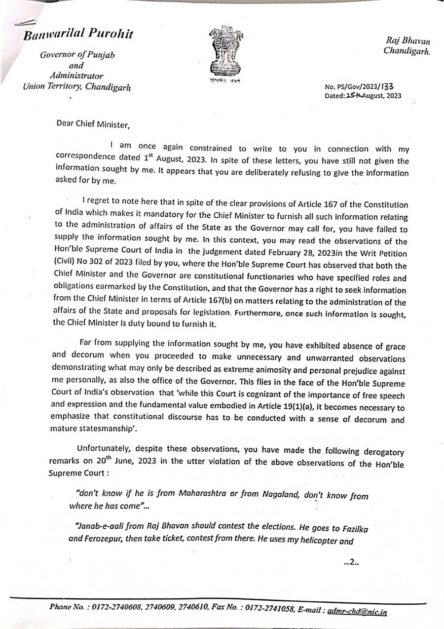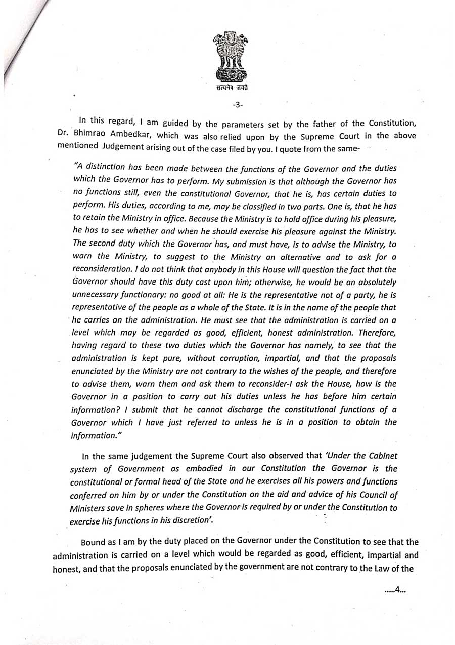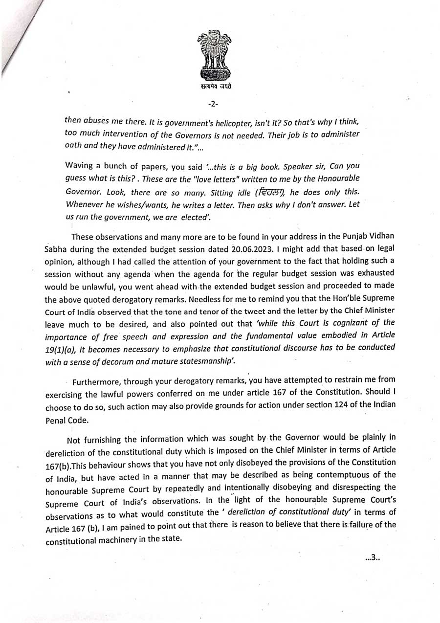 ਰਾਜਪਾਲ ਬਨਵਾਰੀ ਲਾਲ ਪੁਰੋਹਿਤ ਨੇ ਆਪਣੇ ਪੱਤਰ ਵਿੱਚ ਲਿਖਿਆ ਹੈ ਕਿ ਮੇਰੇ ਪੱਤਰ ਦਾ ਜੁਆਬ ਨਹੀਂ ਦੇ ਕੇ ਤੁਸੀਂ ਸੰਵਿਧਾਨਿਕ ਫਰਜ਼ ਦੀ ਅਣਦੇਖੀ ਅਤੇ ਅਪਮਾਨ ਕਰ ਰਹੇ ਹੋ। ਇਸ ਲਈ ਮੇਰੇ ਕੋਲ ਕਾਨੂੰਨੀ ਅਤੇ ਸੰਵਿਧਾਨਿਕ ਕਾਰਵਾਈ ਕਰਨ ਤੋਂ ਇਲਾਵਾ ਕੋਈ ਚਾਰਾ ਨਹੀਂ ਰਹਿ ਜਾਂਦਾ ਹੈ। ਰਾਜਪਾਲ ਬਨਵਾਰੀ ਲਾਲ ਪੁਰੋਹਿਤ ਵੱਲੋਂ ਇਸ ਪੱਤਰ ਵਿੱਚ ਵੀ ਕਿਹਾ ਹੈ ਕਿ ਤੁਸੀਂ ਜਲਦੀ ਹੀ ਮੇਰੇ ਪੱਤਰ ਦਾ ਜੁਆਬ ਦਿਓ, ਨਹੀਂ ਤਾਂ ਕਾਰਵਾਈ ਲਈ ਤਿਆਰ ਰਹੋ।