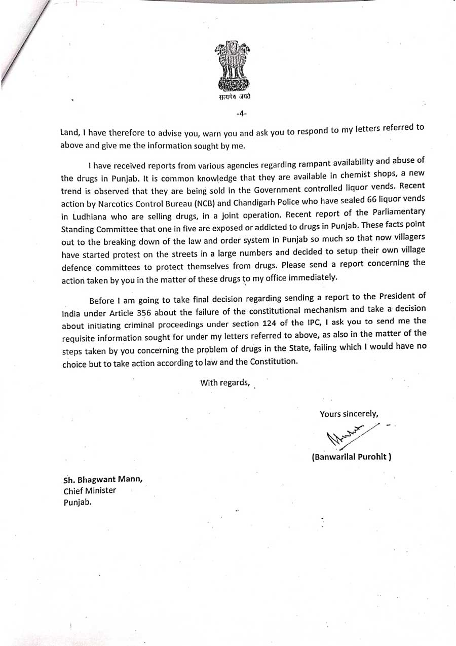 ਨਸ਼ੇ ਦੇ ਮਾਮਲੇ ਵਿੱਚ ਸਰਕਾਰ ਵੱਲੋਂ ਹੁਣ ਤੱਕ ਕੀਤੀ ਗਈ ਹਰ ਤਰਾਂ ਦੀ ਕਾਰਵਾਈ ਦੀ ਮੁਕੰਮਲ ਰਿਪੋਰਟ ਰਾਜਪਾਲ ਦਫ਼ਤਰ ਨੂੰ ਤੁਰੰਤ ਭੇਜੀ ਜਾਵੇ। ਰਾਜਪਾਲ ਵਲੋਂ ਲਿਖਿਆ ਗਿਆ ਕਿ ਪਹਿਲਾਂ ਵਾਂਗ ਇਸ ਪੱਤਰ ਨੂੰ ਸਾਂਭ ਕੇ ਨਾ ਰੱਖਿਆ ਜਾਵੇ ਅਤੇ ਇਨਾਂ ਦਾ ਜੁਆਬ ਦਿੱਤਾ ਜਾਵੇ, ਕਿਉਂਕਿ ਸੁਪਰੀਮ ਕੋਰਟ ਦੇ ਆਦੇਸ਼ਾਂ ਅਨੁਸਾਰ ਆਪ ਨੂੰ ਮੇਰੇ ਵਲੋਂ ਪੁੱਛੇ ਗਏ ਹਰ ਸੁਆਲ ਦਾ ਜੁਆਬ ਸੰਵਿਧਾਨ ਅਨੁਸਾਰ ਦੇਣਾ ਪਏਗਾ।