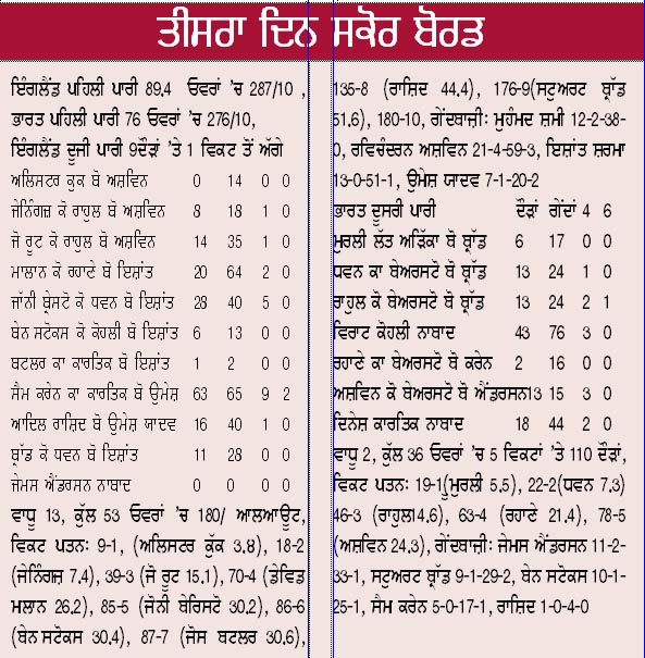 ਭਾਰਤ ਨੇ ਇੰਗਲੈਂਡ ਨੂੰ ਪਹਿਲੀ ਪਾਰੀ ਦੇ ਆਧਾਰ ‘ਤੇ 13 ਦੌੜਾਂ ਦਾ ਵਾਧਾ ਮਿਲਿਆ ਸੀ ਅਤੇ ਅੱਜ ਇੰਗਲੈਂਡ ਨੇ 9 ਦੌੜਾਂ ‘ਤੇ 1 ਵਿਕਟ ਤੋਂ ਅੱਗੇ ਖੇਡਣਾ ਸ਼ੁਰੂ ਕੀਤਾ ਅਤੇ ਸਵੇਰ ਦੇ ਸੈਸ਼ਨ ‘ਚ ਪੰਜ ਵਿਕਟਾਂ ਗੁਆਈਆਂ ਅਸ਼ਵਿਨ ਨੇ ਪੰਜ ਵਿਕਟਾਂ ਚੋਂ ਦੋ ਅਤੇ ਇਸ਼ਾਂਤ ਨੇ ਤਿੰਨ ਵਿਕਟਾਂ ਝਟਕੀਆਂ ਅਸ਼ਵਿਨ ਨੇ ਲੰਚ ਤੱਕ 34 ਦੌੜਾਂ ‘ਤੇ ਤਿੰਨ ਅਤੇ ਇਸ਼ਾਂਤ ਨੇ 21 ਦੌੜਾਂ ‘ਤੇ ਤਿੰਨ ਵਿਕਟਾਂ ਲਈਆਂ ਸਨ ਅਸ਼ਵਿਨ ਨੇ ਸਵੇਰੇ ਜੇਨਿੰਗਸ ਅਤੇ ਕਪਤਾਨ ਜੋ ਰੂਟ ਨੂੰ ਨਿਪਟਾਇਆ ਜਦੋਂਕਿ ਇਸ਼ਾਂਤ ਨੇ ਡੇਵਿਡ ਮਲਾਨ ਅਤੇ ਵਿਕਟਕੀਪਰ ਜਾੱਨੀ ਬੇਰਸਟੋ ਅਤੇ ਹਰਫ਼ਨਮੌਲਾ ਬੇਨ ਸਟੋਕਸ ਨੂੰ ਪੈਵੇਲੀਅਨ ਦੀ ਰਾਹ ਦਿਖਾਈ ਭਾਰਤ ਨੇ ਸਲਿੱਪ ਅਤੇ ਨਜ਼ਦੀਕੀ ਖੇਤਰ ‘ਚ ਸ਼ਾਨਦਾਰ ਕੈਚ ਲਏ ਲੋਕੇਸ਼ ਰਾਹੁਲ ਨੇ ਜੇਨਿੰਗਸ ਅਤੇ ਰੂਟ, ਅਜਿੰਕਾ ਰਹਾਣੇ ਨੇ ਮਲਾਨ, ਧਵਨ ਨੇ ਬੇਰਸਟੋ ਅਤੇ ਕਪਤਾਨਵਿਰਾਟ ਕੋਹਲੀ ਨੇ ਸਟੋਕਸ ਦੇ ਕੈਚ ਲਏ
