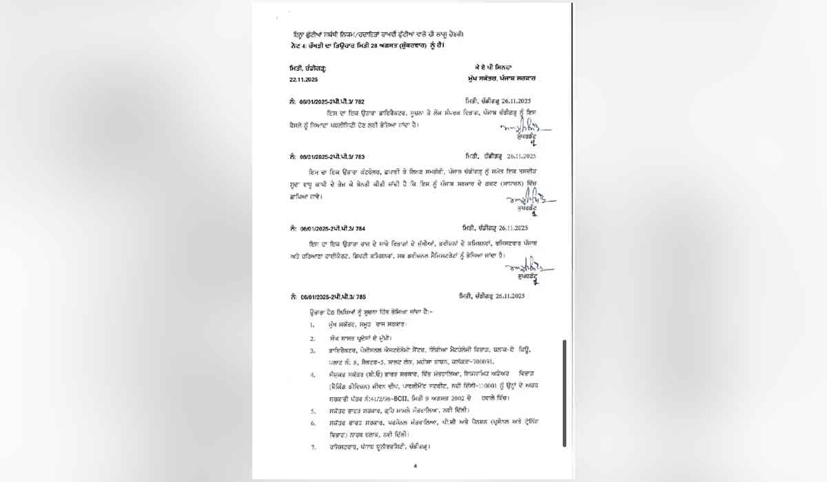 Punjab Holidays: ਚੰਡੀਗੜ੍ਹ (ਸੱਚ ਕਹੂੰ ਨਿਊਜ਼)। ਪੰਜਾਬ ਸਰਕਾਰ ਨੇ ਸਾਲ 2026 ਲਈ ਛੁੱਟੀਆਂ ਦਾ ਕੈਲੰਡਰ ਜਾਰੀ ਕੀਤਾ ਹੈ। ਕੈਲੰਡਰ ਅਨੁਸਾਰ, 2026 ’ਚ 31 ਸਰਕਾਰੀ ਛੁੱਟੀਆਂ ਹੋਣਗੀਆਂ, ਜਿਨ੍ਹਾਂ ਵਿੱਚੋਂ 5 ਐਤਵਾਰ ਨੂੰ ਪੈ ਰਹੀਆਂ ਹਨ। ਸਰਕਾਰੀ ਦਫ਼ਤਰ, ਨਗਰ ਨਿਗਮ ਦਫ਼ਤਰ, ਸਕੂਲ, ਕਾਲਜ ਤੇ ਹੋਰ ਸਰਕਾਰੀ ਸ਼ਾਖਾਵਾਂ ਇਨ੍ਹਾਂ ਛੁੱਟੀਆਂ ’ਤੇ ਬੰਦ ਰਹਿਣਗੀਆਂ। ਜਨਵਰੀ ਮਹੀਨੇ ਵਿੱਚ ਇੱਕ ਸਰਕਾਰੀ ਛੁੱਟੀ ਹੈ। ਇਸ ਵਾਰ 26 ਜਨਵਰੀ ਸੋਮਵਾਰ ਨੂੰ ਹੋਵੇਗੀ। ਫਰਵਰੀ ਮਹੀਨੇ ’ਚ ਦੋ ਛੁੱਟੀਆਂ ਹੋਣਗੀਆਂ, ਪਰ ਦੋਵੇਂ ਐਤਵਾਰ ਨੂੰ ਪੈ ਰਹੀਆਂ ਹਨ। ਸ਼੍ਰੀ ਗੁਰੂ ਰਵਿਦਾਸ ਜਯੰਤੀ 1 ਫਰਵਰੀ ਨੂੰ ਹੈ ਤੇ ਮਹਾਸ਼ਿਵਰਾਤਰੀ 15 ਫਰਵਰੀ ਨੂੰ ਹੈ। ਮਾਰਚ ਤੇ ਅਪਰੈਲ ’ਚ 5-5 ਸਰਕਾਰੀ ਛੁੱਟੀਆਂ ਹਨ। ਇਹ ਪੰਜਾਬ ਸਰਕਾਰ ਦੇ ਪ੍ਰਸੋਨਲ ਵਿਭਾਗ ਵੱਲੋਂ ਤਿਆਰ ਕੀਤਾ ਗਿਆ ਹੈ। ਇਸ ਵਿੱਚ 13 ਰਾਖਵੀਆਂ ਛੁੱਟੀਆਂ ਹੋਣਗੀਆਂ। Punjab Holidays