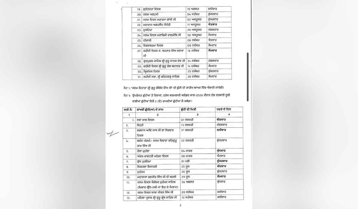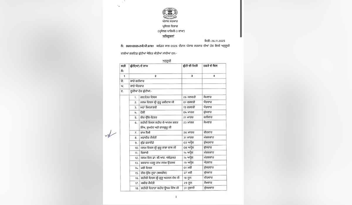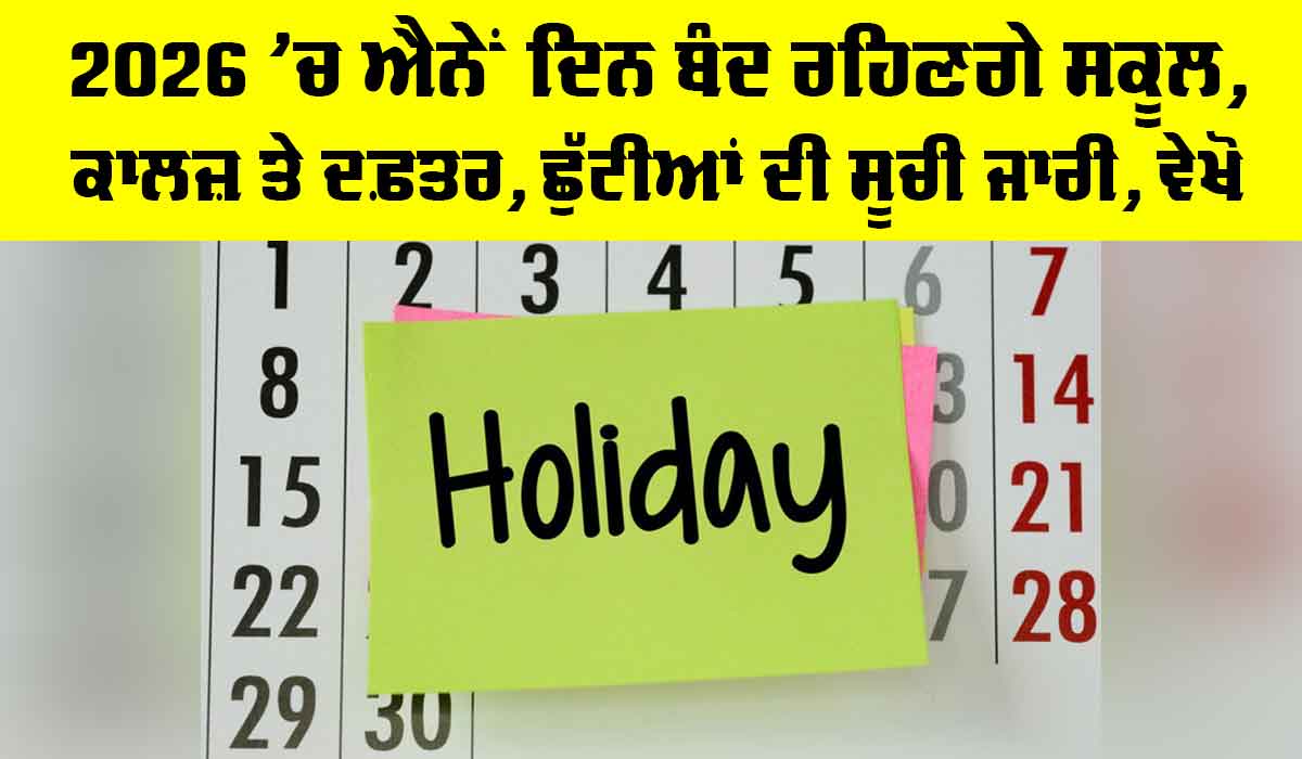 Punjab Holidays: ਚੰਡੀਗੜ੍ਹ (ਸੱਚ ਕਹੂੰ ਨਿਊਜ਼)। ਪੰਜਾਬ ਸਰਕਾਰ ਨੇ ਸਾਲ 2026 ਲਈ ਛੁੱਟੀਆਂ ਦਾ ਕੈਲੰਡਰ ਜਾਰੀ ਕੀਤਾ ਹੈ। ਕੈਲੰਡਰ ਅਨੁਸਾਰ, 2026 ’ਚ 31 ਸਰਕਾਰੀ ਛੁੱਟੀਆਂ ਹੋਣਗੀਆਂ, ਜਿਨ੍ਹਾਂ ਵਿੱਚੋਂ 5 ਐਤਵਾਰ ਨੂੰ ਪੈ ਰਹੀਆਂ ਹਨ। ਸਰਕਾਰੀ ਦਫ਼ਤਰ, ਨਗਰ ਨਿਗਮ ਦਫ਼ਤਰ, ਸਕੂਲ, ਕਾਲਜ ਤੇ ਹੋਰ ਸਰਕਾਰੀ ਸ਼ਾਖਾਵਾਂ ਇਨ੍ਹਾਂ ਛੁੱਟੀਆਂ ’ਤੇ ਬੰਦ ਰਹਿਣਗੀਆਂ। ਜਨਵਰੀ ਮਹੀਨੇ ਵਿੱਚ ਇੱਕ ਸਰਕਾਰੀ ਛੁੱਟੀ ਹੈ। ਇਸ ਵਾਰ 26 ਜਨਵਰੀ ਸੋਮਵਾਰ ਨੂੰ ਹੋਵੇਗੀ। ਫਰਵਰੀ ਮਹੀਨੇ ’ਚ ਦੋ ਛੁੱਟੀਆਂ ਹੋਣਗੀਆਂ, ਪਰ ਦੋਵੇਂ ਐਤਵਾਰ ਨੂੰ ਪੈ ਰਹੀਆਂ ਹਨ। ਸ਼੍ਰੀ ਗੁਰੂ ਰਵਿਦਾਸ ਜਯੰਤੀ 1 ਫਰਵਰੀ ਨੂੰ ਹੈ ਤੇ ਮਹਾਸ਼ਿਵਰਾਤਰੀ 15 ਫਰਵਰੀ ਨੂੰ ਹੈ। ਮਾਰਚ ਤੇ ਅਪਰੈਲ ’ਚ 5-5 ਸਰਕਾਰੀ ਛੁੱਟੀਆਂ ਹਨ। ਇਹ ਪੰਜਾਬ ਸਰਕਾਰ ਦੇ ਪ੍ਰਸੋਨਲ ਵਿਭਾਗ ਵੱਲੋਂ ਤਿਆਰ ਕੀਤਾ ਗਿਆ ਹੈ। ਇਸ ਵਿੱਚ 13 ਰਾਖਵੀਆਂ ਛੁੱਟੀਆਂ ਹੋਣਗੀਆਂ। Punjab Holidays