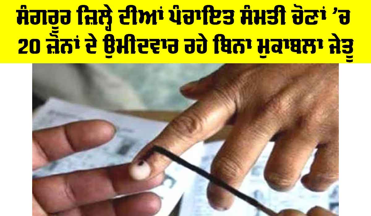 Panchayat Samiti Elections Result: ਸੰਗਰੂਰ (ਗੁਰਪ੍ਰੀਤ ਸਿੰਘ): ਸੰਗਰੂਰ ਜ਼ਿਲ੍ਹੇ ਦੀਆਂ ਪੰਚਾਇਤ ਸੰਮਤੀ ਚੋਣਾਂ ਦੀਆਂ 162 ਜ਼ੋਨਾਂ ਵਿਚੋਂ 20 ਜ਼ੋਨਾਂ ਦੇ ਉਮੀਦਵਾਰ ਬਿਨਾ ਮੁਕਾਬਲਾ ਜੇਤੂ ਰਹੇ ਹਨ। ਇਸ ਸਬੰਧੀ ਜਾਣਕਾਰੀ ਦਿੰਦਿਆਂ ਜ਼ਿਲ੍ਹਾ ਚੋਣ ਅਫ਼ਸਰ ਕਮ ਡਿਪਟੀ ਕਮਿਸ਼ਨਰ ਰਾਹੁਲ ਚਾਬਾ ਨੇ ਦੱਸਿਆ ਕਿ ਪੰਚਾਇਤ ਸੰਮਤੀ ਚੋਣਾਂ ਵਿੱਚ ਸੰਗਰੂਰ ਜ਼ਿਲ੍ਹੇ ਦੇ 162 ਜ਼ੋਨ ਹਨ, ਜਿਨ੍ਹਾਂ ਵਿਚੋਂ 20 ਜ਼ੋਨ ਅਜਿਹੇ ਹਨ, ਜਿਥੇ ਇਕ ਉਮੀਦਵਾਰ ਹੀ ਚੋਣ ਮੈਦਾਨ ਹੋਣ ਕਰਕੇ ਉਹ ਉਮੀਦਵਾਰ ਬਿਨਾਂ ਮੁਕਾਬਲਾ ਜੇਤੂ ਰਹੇ ਹਨ। ਉਨ੍ਹਾਂ ਵੇਰਵੇ ਦਿੰਦਿਆਂ ਦੱਸਿਆ ਕਿ ਪੰਚਾਇਤ ਸੰਮਤੀ ਅੰਨਦਾਣਾ ਐਟ ਮੂਨਕ ਵਿਖੇ ਗੁਲਾੜ੍ਹੀ ਅਤੇ ਕਰੋਦਾ ਜ਼ੋਨ ਦੇ ਉਮੀਦਵਾਰ ਬਿਨਾਂ ਮੁਕਾਬਲਾ ਜੇਤੂ ਰਹੇ ਹਨ।