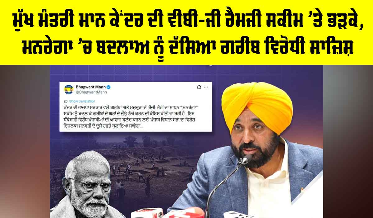 Punjab News: ਚੰਡੀਗੜ੍ਹ। ਪੰਜਾਬ ਦੇ ਮੁੱਖ ਮੰਤਰੀ ਭਗਵੰਤ ਮਾਨ ਨੇ ਵੀਰਵਾਰ ਨੂੰ ਕੇਂਦਰ ਸਰਕਾਰ ਵੱਲੋਂ ਮਨਰੇਗਾ ਦੀ ਥਾਂ ਵੀਬੀ-ਜੀ ਰੈਮ ਜੀ (ਵਿਕਾਸ ਭਾਰਤ ਗਾਰੰਟੀ ਫਾਰ ਇੰਪਲਾਇਮੈਂਟ ਐਂਡ ਲਾਈਵਲੀਹੁੱਡ ਮਿਸ਼ਨ ਰੂਰਲ) ਸਕੀਮ ਲਿਆਉਣ ਦੇ ਫੈਸਲੇ ’ਤੇ ਤਿੱਖੀ ਪ੍ਰਤੀਕਿਰਿਆ ਦਿੱਤੀ। ਇਸ ਨੂੰ ਗਰੀਬਾਂ ਦੀ ਰੋਜ਼ੀ-ਰੋਟੀ ’ਤੇ ਸਿੱਧਾ ਹਮਲਾ ਦੱਸਦੇ ਹੋਏ ਮੁੱਖ ਮੰਤਰੀ ਨੇ ਕਿਹਾ ਕਿ ਭਾਜਪਾ ਸਰਕਾਰ ਮਹਾਤਮਾ ਗਾਂਧੀ ਦਾ ਨਾਂਅ ਹਟਾਉਣ ਤੇ ਇਸ ਯੋਜਨਾ ਦੀ ਭਾਵਨਾ ਨੂੰ ਤਬਾਹ ਕਰਨ ’ਤੇ ਤੁਲੀ ਹੋਈ ਹੈ। ਮਾਨ ਨੇ ਐਲਾਨ ਕੀਤਾ ਕਿ ਸੂਬਾ ਸਰਕਾਰ ਇਸ ਮੁੱਦੇ ’ਤੇ ਪੰਜਾਬੀਆਂ ਦੀ ਆਵਾਜ਼ ਬੁਲੰਦ ਕਰਨ ਲਈ ਜਨਵਰੀ ਦੇ ਦੂਜੇ ਹਫ਼ਤੇ ਪੰਜਾਬ ਵਿਧਾਨ ਸਭਾ ਦਾ ਵਿਸ਼ੇਸ਼ ਸੈਸ਼ਨ ਬੁਲਾਏਗੀ। ਇਹ ਫੈਸਲਾ ਆਮ ਆਦਮੀ ਪਾਰਟੀ ਦੇ ਰਾਸ਼ਟਰੀ ਕਨਵੀਨਰ ਅਰਵਿੰਦ ਕੇਜਰੀਵਾਲ ਸਮੇਤ ਚੋਟੀ ਦੇ ਆਗੂਆਂ ਨਾਲ ਮੀਟਿੰਗ ਤੋਂ ਬਾਅਦ ਲਿਆ ਗਿਆ। Punjab News
