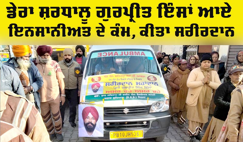 Body Donation: (ਬੂਟਾ ਸਿੰਘ) ਲੁਧਿਆਣਾ। ਜਿਉਂਦੇ ਜੀਅ ਆਪਣੇ ਮੁਰਸ਼ਿਦ-ਏ-ਕਾਮਿਲ ਦੇ ਬਚਨਾਂ ਮੁਤਾਬਿਕ ਮਾਨਵਤਾ ਦੀ ਸੇਵਾ ’ਚ ਹਮੇਸ਼ਾ ਵੱਧ-ਚੜ੍ਹਕੇ ਹਿੱਸਾ ਲੈਣ ਵਾਲੇ ਲੁਧਿਆਣਾ ਦੇ ਮੁਹੱਲਾ ਬਾਬਾ ਦੀਪ ਸਿੰਘ ਨਗਰ ਦੁਗਰੀ ਦੇ ਵਸਨੀਕ ਗੁਰਪ੍ਰੀਤ ਸਿੰਘ ਇੰਸਾਂ ਮਰ ਕੇ ਵੀ ਇਨਸਾਨੀਅਤ ਪ੍ਰਤੀ ਆਪਣੇ ਫਰਜ਼ਾਂ ਨੂੰ ਬਾਖੂਬੀ ਨਿਭਾ ਗਏ ਹਨ। ਗੁਰਪ੍ਰੀਤ ਸਿੰਘ ਇੰਸਾਂ ਦੀ ਅੰਤਿਮ ਇੱਛਾ ਅਨੁਸਾਰ ਉਨ੍ਹਾਂ ਦੀ ਮ੍ਰਿਤਕ ਦੇਹ ਨੂੰ ਪਰਿਵਾਰ ਨੇ ਪੂਜਨੀਕ ਗੁਰੂ ਸੰਤ ਡਾ. ਗੁਰਮੀਤ ਰਾਮ ਰਹੀਮ ਸਿੰਘ ਜੀ ਇੰਸਾਂ ਦੀਆਂ ਮਹਾਨ ਸਿੱਖਿਆਵਾਂ ਤਹਿਤ ਮੈਡੀਕਲ ਖੋਜ ਕਾਰਜਾਂ ਵਾਸਤੇ ਦਾਨ ਕੀਤਾ ਹੈ।