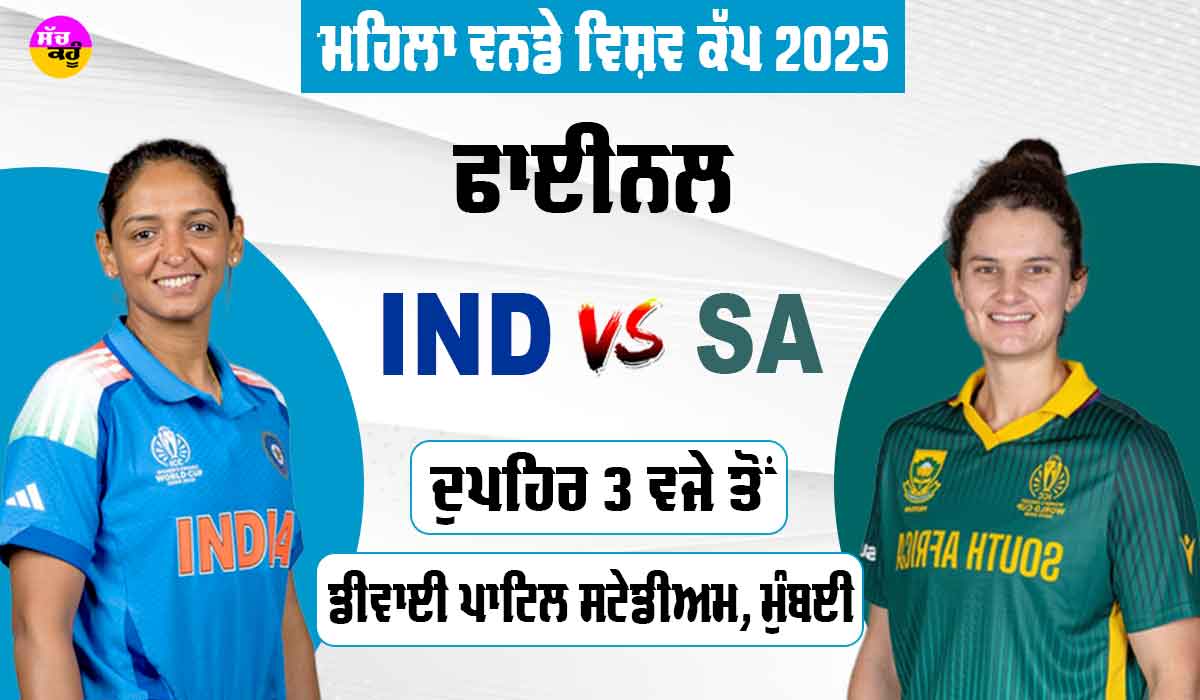 ਭਾਰਤ ਤੇ ਦੱਖਣੀ ਅਫਰੀਕਾ ਵਿਚਕਾਰ ਮਹਿਲਾ ਵਨਡੇ ਵਿਸ਼ਵ ਕੱਪ ਫਾਈਨਲ ਦਾ ਸਟਾਰ ਸਪੋਰਟਸ ਨੈੱਟਵਰਕ ’ਤੇ ਸਿੱਧਾ ਪ੍ਰਸਾਰਣ ਕੀਤਾ ਜਾਵੇਗਾ। ਲਾਈਵ ਸਟ੍ਰੀਮਿੰਗ ਜੀਓ ਹੌਟਸਟਾਰ ਐਪ ਤੇ ਹੋਵੇਗੀ। ਤੁਸੀਂ ‘ਸੱਚ ਕਹੂੰ ਪੰਜਾਬੀ’ ’ਤੇ ਮੈਚ ਦੀ ਲਾਈਵ ਕਵਰੇਜ ਨੂੰ ਵੀ ਵੇਖ ਸਕਦੇ ਹੋ। World Cup Final