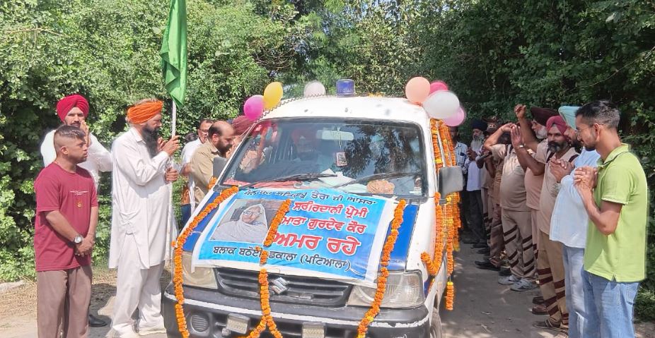 ਇਸ ਮੌਕੇ ਸਰਪੰਚ ਮਲਕੀਤ ਸਿੰਘ ਅਤੇ ਸੱਚੇ ਨਿਮਰ ਸੇਵਾਦਾਰ ਹਰਮਿੰਦਰ ਨੋਨਾ, ਕੈਪਟਨ ਜਰਨੈਲ ਸਿੰਘ, ਹਰਜਿੰਦਰ ਇੰਸਾਂ ਆਦਿ ਵੱਲੋਂ ਹਰੀ ਝੰਡੀ ਦੇ ਕੇ ਵੈਨ ਨੂੰ ਰਵਾਨਾ ਕੀਤਾ ਗਿਆ। ਇਸ ਮੌਕੇ ਮਾਤਾ ਗੁਰਦੇਵ ਕੌਰ ਇੰਸਾਂ ਅਮਰ ਰਹੇ ਤੇ ਜਬ ਤੱਕ ਸੂਰਜ ਚਾਂਦ ਰਹੇਗਾ ਤਦ ਤੱਕ ਮਾਤਾ ਗੁਰਦੇਵ ਕੌਰ ਇੰਸਾਂ ਤੇਰਾ ਨਾਮ ਰਹੇਗਾ ਦੇ ਆਕਾਸ਼ ਗੁੰਜਾਊ ਨਾਰਿਆਂ ਨਾਲ ਰਿਸ਼ਤੇਦਾਰਾਂ, ਪਰਿਵਾਰਕ ਮੈਂਬਰਾਂ, ਸ਼ਾਹ ਸਤਿਨਾਮ ਜੀ ਗ੍ਰੀਨ ਐਸ ਵੈਲਫੇਅਰ ਫੋਰਸ ਕਮੇਟੀ ਦੇ ਸੇਵਾਦਾਰਾਂ, ਬਲਾਕ ਬਠੋਈ-ਡਕਾਲਾ ਦੀ ਸਮੂਹ ਸਾਧ ਸੰਗਤ ਨੇ ਮ੍ਰਿਤਕ ਦੇਹ ਨੂੰ ਫੁੱਲਾਂ ਨਾਲ ਸਿੰਗਾਰੀ ਹੋਈ ਐਬੂਲੈਂਸ ਰਾਹੀਂ ਪਿੰਡ ਵਿੱਚੋਂ ਕਾਫਲੇ ਦੇ ਰੂਪ ’ਚ ਰਵਾਨਾ ਕੀਤਾ। Body Donation