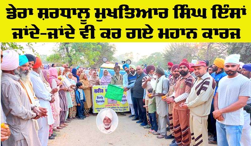 Body Donation: (ਕਰਮ ਥਿੰਦ) ਸੁਨਾਮ ਊਧਮ ਸਿੰਘ ਵਾਲਾ। ਪਿੰਡ ਨੀਲੋਵਾਲ ਦੇ 90 ਵਰ੍ਹਿਆਂ ਦੇ ਡੇਰਾ ਸੱਚਾ ਸੌਦਾ ਦੇ ਸ਼ਰਧਾਲੂ ਮੁਖਤਿਆਰ ਸਿੰਘ ਇੰਸਾਂ ਦਾ ਮ੍ਰਿਤਕ ਸਰੀਰ ਮੈਡੀਕਲ ਖੋਜ ਕਾਰਜਾਂ ਲਈ ਦਾਨ ਕੀਤਾ ਗਿਆ ਹੈ। ਜਾਣਕਾਰੀ ਮੁਤਾਬਕ ਪਿੰਡ ਨੀਲੋਵਾਲ ਦੇ ਰਹਿਣ ਵਾਲੇ ਡੇਰਾ ਸ਼ਰਧਾਲੂ ਮੁਖਤਿਆਰ ਸਿੰਘ ਇੰਸਾਂ ਦਾ ਦੇਹਾਂਤ ਹੋ ਗਿਆ ਸੀ। ਉਨ੍ਹਾਂ ਨੇ ਜਿਉਂਦੇ ਜੀਅ ਦੇਹਾਂਤ ਉਪਰੰਤ ਸਰੀਰ ਮੈਡੀਕਲ ਖੋਜਾਂ ਲਈ ਦਾਨ ਕਰਨ ਦਾ ਪ੍ਰਣ ਕੀਤਾ ਸੀ ਉਨ੍ਹਾਂ ਵੱਲੋਂ ਕੀਤੇ ਗਏ ਪ੍ਰਣ ਨੂੰ ਉਨ੍ਹਾਂ ਦੀ ਪਤਨੀ ਲਾਭ ਕੌਰ ਇੰਸਾਂ, ਪੁੱਤਰ ਕਾਕਾ ਸਿੰਘ, ਪੋਤਰੇ ਜੋਗਾ ਸਿੰਘ ਇੰਸਾਂ, ਮੱਖਣ ਸਿੰਘ ਇੰਸਾਂ, ਬਾਬੂ ਸਿੰਘ ਇੰਸਾਂ, ਮੱਖਣ ਸਿੰਘ ਇੰਸਾਂ, ਬੇਟੀਆਂ ਪੰਮੀ ਕੌਰ, ਪਾਲ ਕੌਰ, ਭੰਤੋ ਕੌਰ, ਪਿਰਤਪਾਲ ਕੌਰ ਅਤੇ ਰਾਣੀ ਕੌਰ ਵੱਲੋਂ ਪੂਰਾ ਕਰਦਿਆਂ ਮ੍ਰਿਤਕ ਦੇਹ ਮੈਡੀਕਲ ਖੋਜਾਂ ਲਈ ਦਾਨ ਕੀਤੀ ਗਈ ।