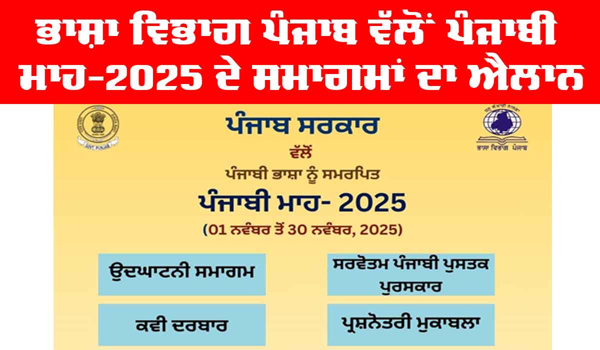 Bhasha Vibhag Punjab: ਪਟਿਆਲਾ (ਖੁਸ਼ਵੀਰ ਸਿੰਘ ਤੂਰ)। ਪੰਜਾਬ ਸਰਕਾਰ ਦੀ ਅਗਵਾਈ ’ਚ ਭਾਸ਼ਾ ਵਿਭਾਗ ਪੰਜਾਬ ਵੱਲੋਂ ਕਰਵਾਏ ਜਾਣ ਵਾਲੇ ਪੰਜਾਬੀ ਮਾਹ-2025 ਦੇ ਸਾਹਿਤਕ ਤੇ ਸੱਭਿਆਚਾਰਕ ਸਮਾਗਮਾਂ ਦੀ ਰੂਪ-ਰੇਖਾ ਦਾ ਐਲਾਨ ਕਰ ਦਿੱਤਾ ਗਿਆ ਹੈ। ਵਿਭਾਗ ਦੇ ਡਾਇਰੈਕਟਰ ਜਸਵੰਤ ਸਿੰਘ ਜ਼ਫ਼ਰ ਨੇ ਦੱਸਿਆ ਕਿ ਪੰਜਾਬੀ ਮਾਹ ਦਾ ਰਾਜ ਪੱਧਰੀ ਉਦਘਾਟਨੀ ਸਮਾਗਮ 1 ਨਵੰਬਰ ਨੂੰ ਉੱਤਰੀ ਖੇਤਰ ਸੱਭਿਆਚਾਰਕ ਕੇਂਦਰ ਪਟਿਆਲਾ ਦੇ ਕਾਲੀਦਾਸ ਆਡੀਟੋਰੀਅਮ ਵਿਖੇ ਸਵੇਰੇ 10 ਵਜੇ ਸ਼ੁਰੂ ਹੋਵੇਗਾ ਜਿਸ ਵਿੱਚ ਸੂਬੇ ਦੇ ਉਚੇਰੀ ਸਿੱਖਿਆ ਤੇ ਭਾਸ਼ਾ ਮੰਤਰੀ ਹਰਜੋਤ ਸਿੰਘ ਬੈਂਸ ਮੁੱਖ ਮਹਿਮਾਨ ਵਜੋਂ ਸ਼ਮੂਲੀਅਤ ਕਰਨਗੇ ਅਤੇ ਸਮਾਗਮ ਦੀ ਪ੍ਰਧਾਨਗੀ ਡਾ. ਸਰਦਾਰਾ ਸਿੰਘ ਜੌਹਲ ਪਦਮ ਭੂਸ਼ਨ ਕਰਨਗੇ।