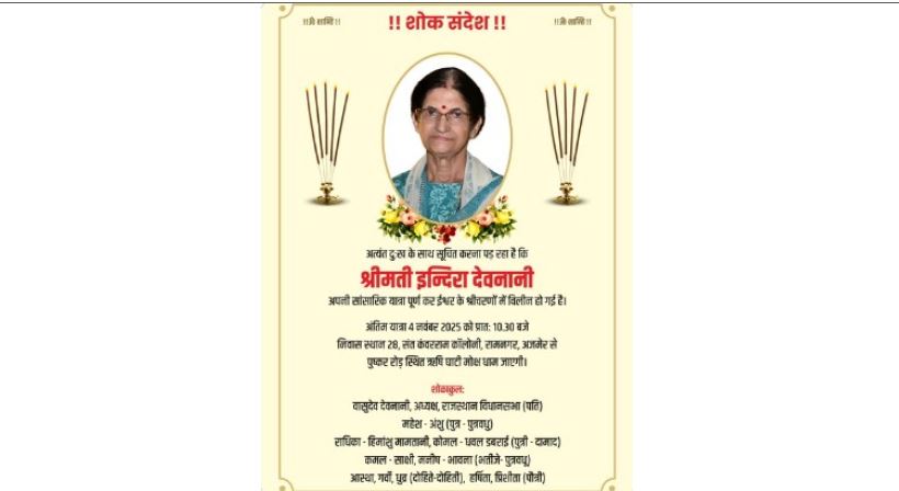 ਇਸ ਵਾਰ, ਇੰਟੈਂਸਿਵ ਕੇਅਰ ਦੇ ਬਾਵਜੂਦ, ਉਸਦੀ ਹਾਲਤ ਵਿੱਚ ਕੋਈ ਸੁਧਾਰ ਨਹੀਂ ਹੋਇਆ। ਇੰਦਰਾ ਦੇਵੀ ਇੱਕ ਸੇਵਾ ਮੁਕਤ ਸਕੂਲ ਅਧਿਆਪਕਾ ਸੀ ਅਤੇ ਲੰਬੇ ਸਮੇਂ ਤੋਂ ਸਿਹਤ ਸਮੱਸਿਆਵਾਂ ਤੋਂ ਪੀੜਤ ਸੀ। 1948 ਵਿੱਚ ਅਜਮੇਰ ਵਿੱਚ ਜਨਮੇ ਵਾਸੂਦੇਵ ਦੇਵਨਾਨੀ ਨੇ 1974 ਵਿੱਚ ਇੰਦਰਾ ਦੇਵੀ ਨਾਲ ਵਿਆਹ ਕੀਤਾ ਸੀ। ਇਸ ਜੋੜੇ ਦਾ ਇੱਕ ਪੁੱਤਰ ਅਤੇ ਦੋ ਧੀਆਂ ਹਨ। ਭਾਰਤੀ ਜਨਤਾ ਪਾਰਟੀ ਦੇ ਸੀਨੀਅਰ ਨੇਤਾ ਵਾਸੂਦੇਵ ਦੇਵਨਾਨੀ ਅਜਮੇਰ ਉੱਤਰੀ ਵਿਧਾਨ ਸਭਾ ਹਲਕੇ ਦੀ ਨੁਮਾਇੰਦਗੀ ਕਰਦੇ ਹਨ ਅਤੇ 2023 ਤੋਂ ਰਾਜਸਥਾਨ ਵਿਧਾਨ ਸਭਾ ਦੇ ਸਪੀਕਰ ਵਜੋਂ ਸੇਵਾ ਨਿਭਾ ਰਹੇ ਹਨ। ਸੋਮਵਾਰ ਨੂੰ ਰਾਜਸਥਾਨ ਦੇ ਰਾਜਪਾਲ ਹਰੀਭਾਊ ਬਾਗੜੇ ਨੇ ਦੇਵਨਾਨੀ ਦੇ ਨਿਵਾਸ ਸਥਾਨ ‘ਤੇ ਜਾ ਕੇ ਉਨ੍ਹਾਂ ਨੂੰ ਸ਼ਰਧਾਂਜਲੀ ਦਿੱਤੀ ਅਤੇ ਸੋਗ ਮਨਾਉਣ ਵਾਲੇ ਪਰਿਵਾਰ ਨਾਲ ਸੰਵੇਦਨਾ ਪ੍ਰਗਟ ਕੀਤੀ। Rajasthan News