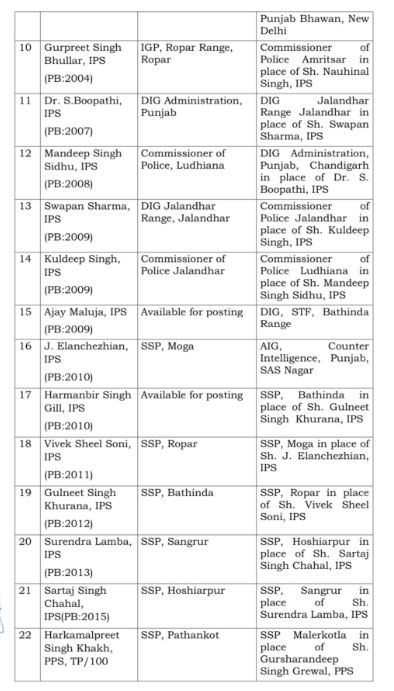 ਗੁਰਪ੍ਰੀਤ ਸਿੰਘ ਭੁੱਲਰ ਨੂੰ ਕਮਿਸ਼ਨਰ ਆਫ਼ ਪੁਲਿਸ ਅੰਮਿ੍ਰਤਸ਼ਰ, ਡਾ. ਐਸ. ਭੂਪਤੀ ਨੂੰ ਡੀ.ਆਈ.ਜੀ. ਜਲੰਧਰ ਰੇਂਜ, ਮਨਦੀਪ ਸਿੰਘ ਸਿੱਧੂ ਨੂੰ ਡੀ.ਆਈ.ਜੀ. ਐਡਮਿਨਸਟ੍ਰੈਸਨ ਪੰਜਾਬ, ਚੰਡੀਗੜ, ਸਵਪਨ ਸ਼ਰਮਾ ਨੂੰ ਕਮਿਸ਼ਨਰ ਆਫ਼ ਪੁਲਿਸ ਜਲੰਧਰ, ਕੁਲਦੀਪ ਸਿੰਘ ਨੂੰ ਕਮਿਸ਼ਨਰ ਆਫ਼ ਪੁਲਿਸ ਲੁਧਿਆਣਾ, ਅਜੈ ਮਲੂਜਾ ਨੂੰ ਡੀ.ਆਈ.ਜੀ. ਐਸ.ਟੀ.ਐਫ਼. ਬਠਿੰਡਾ, ਜੇ. ਈਲਾਚੈਜੀਅਨ ਨੂੰ ਏ.ਆਈ.ਜੀ. ਕਾਉਂਟਰ ਇੰਟੈਲੀਜੈਂਸ,
