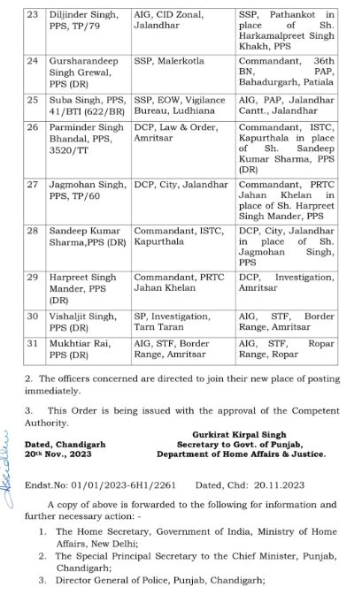 ਜਗਮੋਹਨ ਸਿੰਘ ਨੂੰ ਕਮਾਂਡੈਂਟ ਪੀਆਰਟੀਸੀ ਜਹਨ ਖੇਲਨ, ਸੰਦੀਪ ਕੁਮਾਰ ਸ਼ਰਮਾ ਨੂੰ ਡੀਐਸਪੀ ਸਿੱਟੀ ਜਲੰਧਰ, ਹਰਪ੍ਰੀਤ ਸਿੰਘ ਮੰਡਰ ਨੂੰ ਡੀਐਸਪੀ ਇਨਵੈਸਟੀਗੇਸ਼ਨ, ਵਿਸ਼ਾਲਜੀਤ ਸਿੰਘ ਨੂੰ ਏ.ਆਈ.ਜੀ. ਐਸ.ਟੀ.ਐਫ਼ ਅੰਮਿ੍ਰਤਸ਼ਰ, ਮੁਖਤਿਆਰ ਰਾਏ ਨੂੰ ਏ.ਆਈ.ਜੀ. ਐਸ.ਟੀ.ਐਫ ਰੋਪੜ ਅਤੇ ਨੌਨਿਹਾਲ ਸਿੰਘ ਨੂੰ ਕੋਈ ਪੋਸਟਿੰਗ ਨਹੀਂ ਦਿੱਤੀ ਗਈ ਹੈ। Punjab Police