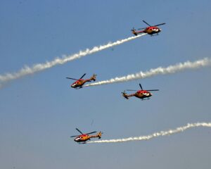 ਸਾਰੰਗ ਹੈਲੀਕਾਪਟਰ ਡਿਸਪਲੇਅ ਟੀਮ ਨੇ ਆਪਣੇ ਪੰਜ ਰੰਗੀਨ ਹੈਲੀਕਾਪਟਰਾਂ ਨਾਲ, ਜਲ ਮਹਿਲ ਦੇ ਕੰਢੇ ਤੋਂ ਖੁੱਲ੍ਹੇ ਅਸਮਾਨ ਵਿੱਚ ਸ਼ੁੱਧਤਾ ਅਤੇ ਟੀਮ ਤਾਲਮੇਲ ਦਾ ਇੱਕ ਸ਼ਾਨਦਾਰ ਪ੍ਰਦਰਸ਼ਨ ਕੀਤਾ। ਇੱਕ ਸੁਰ ਵਿੱਚ ਉੱਡਦੇ ਹੋਏ, ਹੈਲੀਕਾਪਟਰਾਂ ਨੇ ਗੁੰਝਲਦਾਰ ਬਣਤਰਾਂ ਬਣਾਈਆਂ ਅਤੇ ਹੈਰਾਨੀਜਨਕ ਹਵਾਈ ਹਰਕਤਾਂ ਕੀਤੀਆਂ, ਦਰਸ਼ਕਾਂ ਨੂੰ ਮੋਹਿਤ ਕੀਤਾ। ਹੈਲੀਕਾਪਟਰਾਂ ਦੀ ਸਟੀਕ ਦੂਰੀ, ਸੰਤੁਲਨ ਅਤੇ ਤਾਲਮੇਲ ਭਾਰਤੀ ਹਵਾਈ ਸੈਨਾ ਦੇ ਅਨੁਸ਼ਾਸਨ ਅਤੇ ਉੱਚ-ਪੱਧਰੀ ਸਿਖਲਾਈ ਦੀ ਇੱਕ ਜੀਵਤ ਉਦਾਹਰਣ ਸੀ, ਜਿਸਦੀ ਦਰਸ਼ਕਾਂ ਨੇ ਬਹੁਤ ਪ੍ਰਸ਼ੰਸਾ ਕੀਤੀ।