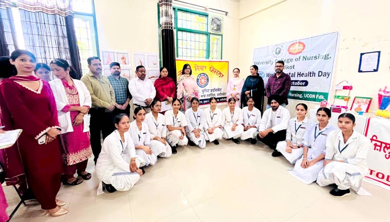 World Mental Health Day: (ਗੁਰਪ੍ਰੀਤ ਪੱਕਾ) ਫਰੀਦਕੋਟ। ਯੂਨੀਵਰਸਿਟੀ ਕਾਲਜ ਆਫ ਨਰਸਿੰਗ, ਫਰੀਦਕੋਟ ਦੇ ਮਾਨਸਿਕ ਸਿਹਤ ਵਿਭਾਗ ਵੱਲੋਂ ਡਾ. ਹਰਦੀਪ ਕੌਰ ਮੱਲ, ਪ੍ਰਿੰਸੀਪਲ ਯੂਕੋਨ ਅਤੇ ਐਨ.ਐਸ.ਐਸ. ਯੂਨਿਟ ਦੇ ਸਹਿਯੋਗ ਨਾਲ ਮਾਨਸਿਕ ਸਿਹਤ ਦਿਵਸ ਮਨਾਇਆ ਗਿਆ। ਇਸ ਪ੍ਰੋਗਰਾਮ ਦਾ ਆਯੋਜਨ ਗੁਰੂ ਗੋਬਿੰਦ ਸਿੰਘ ਮੈਡੀਕਲ ਹਸਪਤਾਲ ਦੇ ਮਨੋਰੋਗ ਅਤੇ ਨਸ਼ਾ ਛੁਡਾਊ ਵਿਭਾਗ ਵਿੱਚ ਕੀਤਾ ਗਿਆ। ਇਸ ਮੌਕੇ ’ਤੇ ਮਿਸ ਗੁਰਪ੍ਰੀਤ ਕੌਰ, ਸੈਕਟਰੀ ਫਰੀ ਲੀਗਲ ਏਡ ਕਮ ਸੀ.ਜੇ.ਐਮ., ਨਰਸਿੰਗ ਕਾਲਜ ਦੇ ਵਾਈਸ ਪ੍ਰਿੰਸੀਪਲ ਸ੍ਰੀ ਹੇਮੰਤ ਸੈਣੀ ਅਤੇ ਪ੍ਰੋਫੈਸਰ ਸ੍ਰੀ ਅਨਿਲ ਕੁਮਾਰ ਨੇ ਹਾਜ਼ਰੀ ਭਰੀ। ਵਿਭਾਗ ਦੇ ਸੀਨੀਅਰ ਡਾਕਟਰਾਂ ਅਤੇ ਨਰਸਿੰਗ ਸਟਾਫ਼ ਨੇ ਵੀ ਸਰਗਰਮ ਹਿੱਸਾ ਲਿਆ।