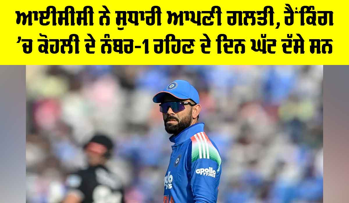 14 ਜਨਵਰੀ ਨੂੰ ਆਈਸੀਸੀ ਨੇ ਵਿਰਾਟ ਕੋਹਲੀ ਨਾਲ ਜੁੜਿਆ ਇੱਕ ਡੇਟਾ ਸੋਸ਼ਲ ਮੀਡੀਆ ’ਤੇ ਸਾਂਝਾ ਕੀਤਾ ਸੀ, ਜੋ ਬਾਅਦ ’ਚ ਗਲਤ ਸਾਬਤ ਹੋਇਆ। ਗਲਤੀ ਸਾਹਮਣੇ ਆਉਣ ਤੋਂ ਬਾਅਦ ਆਈਸੀਸੀ ਨੇ ਉਸ ਕਾਪੀ ਨੂੰ ਠੀਕ ਕਰ ਦਿੱਤਾ। ਇਸ ਤੋਂ ਪਹਿਲਾਂ ਆਈਸੀਸੀ ਨੇ ਦੱਸਿਆ ਸੀ ਕਿ ਵਿਰਾਟ ਕੋਹਲੀ ਕੁੱਲ 825 ਦਿਨਾਂ ਤੱਕ ਵਨਡੇ ਰੈਂਕਿੰਗ ’ਚ ਨੰਬਰ-1 ’ਤੇ ਬਣੇ ਹਨ, ਜਿਸ ਦੇ ਆਧਾਰ ’ਤੇ ਉਹ ਇਸ ਸੂਚੀ ’ਚ ਦੁਨੀਆ ’ਚ 10ਵੇਂ ਸਥਾਨ ’ਤੇ ਹਨ।