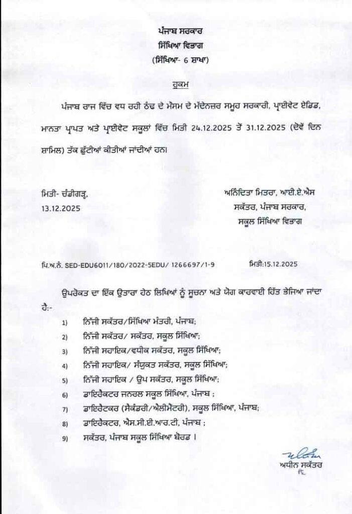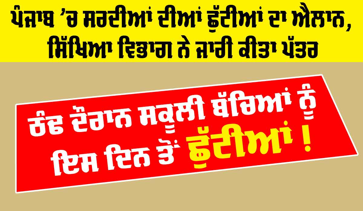 Winter Vacations Punjab: ਚੰਡੀਗੜ੍ਹ (ਅਸ਼ਵਨੀ ਚਾਵਲਾ)। ਪੰਜਾਬ ’ਚ ਸਰਦੀਆਂ ਦੀਆਂ ਛੁੱਟੀਆਂ ਦਾ ਐਲਾਨ ਕਰ ਦਿੱਤਾ ਗਿਆ ਹੈ। ਇਸ ਲਈ ਬਕਾਇਦਾ ਸਿੱਖਿਆ ਵਿਭਾਗ ਵੱਲੋਂ ਪੱਤਰ ਜਾਰੀ ਕਰਦੇ ਹੋਏ ਪੰਜਾਬ ਦੇ ਸਾਰੇ ਸਰਕਾਰੀ ਤੇ ਮਾਨਤਾ ਪ੍ਰਾਪਤ ਸਕੂਲਾਂ ਸਮੇਤ ਗੈਰ-ਸਰਕਾਰੀ ਸਕੂਲਾਂ ਨੂੰ ਵੀ ਇਨ੍ਹਾਂ ਛੁੱਟੀਆਂ ਦੇ ਆਦੇਸ਼ਾਂ ਨੂੰ ਲਾਗੂ ਕਰਨ ਲਈ ਕਿਹਾ ਗਿਆ ਹੈ। ਸਿੱਖਿਆ ਵਿਭਾਗ ਦੇ ਪੱਤਰ ਅਨੁਸਾਰ ਪੰਜਾਬ ਵਿੱਚ ਸਰਦੀਆਂ ਦੀਆਂ ਛੁੱਟੀਆਂ 24 ਦਸੰਬਰ ਤੋਂ ਸ਼ੁਰੂ ਹੁੰਦੇ ਹੋਏ 31 ਦਸੰਬਰ ਤੱਕ ਚਲਣਗੀਆਂ।