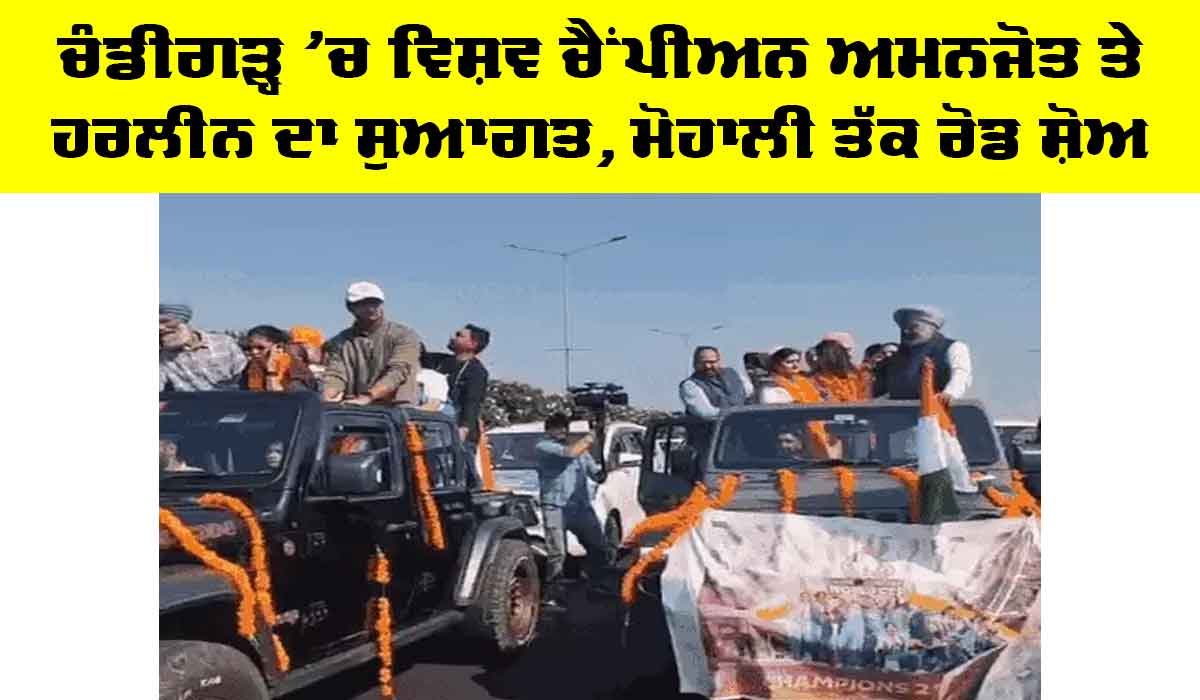 Amanjot Harleen Welcome Celebration: ਚੰਡੀਗੜ੍ਹ (ਸੱਚ ਕਹੂੰ ਨਿਊਜ਼)। ਭਾਰਤੀ ਮਹਿਲਾ ਕ੍ਰਿਕੇਟ ਟੀਮ ਦੀਆਂ ਖਿਡਾਰਨਾਂ ਹਰਲੀਨ ਦਿਓਲ ਤੇ ਅਮਨਜੋਤ ਕੌਰ, ਜਿਨ੍ਹਾਂ ਨੇ ਮਹਿਲਾ ਵਿਸ਼ਵ ਕੱਪ ਜਿੱਤਿਆ ਹੈ, ਦਾ ਘਰ ਵਾਪਸੀ ’ਤੇ ਸ਼ਾਨਦਾਰ ਸਵਾਗਤ ਕੀਤਾ ਜਾ ਰਿਹਾ ਹੈ। ਹਰਲੀਨ ਤੇ ਅਮਨਜੋਤ ਸ਼ੁੱਕਰਵਾਰ ਸਵੇਰੇ ਚੰਡੀਗੜ੍ਹ ਹਵਾਈ ਅੱਡੇ ’ਤੇ ਉਤਰੀਆਂ। ਪਰਿਵਾਰ ਤੇ ਪ੍ਰਸ਼ੰਸਕਾਂ ਦੀ ਇੱਕ ਵੱਡੀ ਭੀੜ ਨੇ ਦੋਵਾਂ ਖਿਡਾਰਨਾਂ ਦਾ ਸਵਾਗਤ ਕੀਤਾ। ਪੰਜਾਬ ‘ਆਪ’ ਸਰਕਾਰ ਦੇ ਮੰਤਰੀ ਹਰਪਾਲ ਚੀਮਾ ਤੇ ਲੋਕ ਸਭਾ ਮੈਂਬਰ ਗੁਰਮੀਤ ਮੀਤ ਹੇਅਰ ਵੀ ਪਹੁੰਚੇ। Amanjot Harleen Welcome Celebration